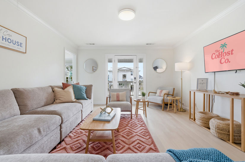 Step into a spacious and beautifully designed beach retreat, featuring an open floor plan that maximizes natural light and coastal vibes. The living area is adorned with comfortable furnishings, providing the perfect space for relaxation and conversation. Large windows with french glass door allow you to enjoy the views of our pool. The porch off the home is screened in to enjoy year round!